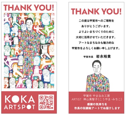 やまなみ工房さまとの市長似顔絵アートコラボ制作も最終章です!すべてのアーティストの作品を使用したいくらい、すべてクオリティが高く、選ぶのに大変、苦労をしました。最終的に1つには決めることができず、5人のアーティストの作品をセレクトしました!どれもこれもインパクトのある甲賀市ふるさと納税寄附者へのサンクスカードの誕生です!篤とご覧下さい!甲賀市とやまなみ工房さまとのアートなまちづくりブランディング第1弾ふるさと納税サンクスカードプロジェクトにお付き合いいただきありがとうございました! 第2弾第3弾も乞うご期待です!